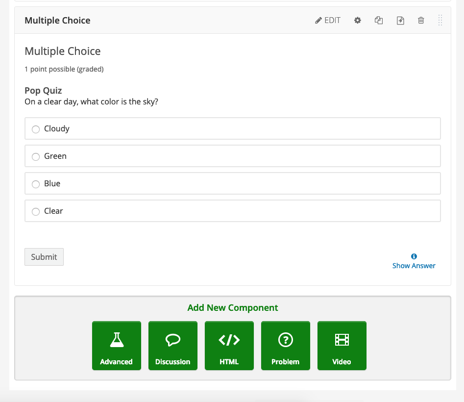 A base do seu curso é como o curso é organizado. Studio oferece um editor de estrutura geral do curso, o qual disponibiliza uma hierarquia e a possibilidade de facilmente arrastar e largar componentes para o ajudar a si e aos seus alunos a manterem-se organizados.
